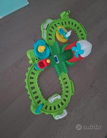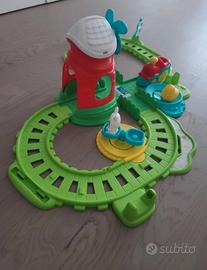 un colorato trenino a batterie su una pista che è anche un play set ambientato nel mondo della fattoria; la locomotiva parlante riproduce effetti sonori realistici, versi degli animali, canzoncine e filastrocche