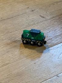Set completo di trenino Brio con tre locomotive perfettamente funzionanti (2 a pile ed una con USB) ed i relativi vagoni, comprensivo di 34 rettilinei (tra lunghi corti), 28 curve, incroci, ponti e scambi.