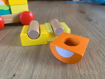 Un trenino colorato dalle linee semplici, da costruire impilando gli elementi sui perni. Una locomotiva e due vagoni: mettere e togliere, ecco un'attività da ripetere a piacere.