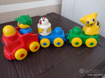 Trenino Lego con 3 personaggi composto da una locomotiva e due vagoni come da foto