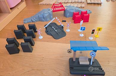 Trenino lidl con binari in legno, con molti pezzi di rotaia, stazione, passaggio a livello, ponte , incroci e scambi, 2 locomotive a batteria di cui una con comando a distanza, vari personaggi e vagoni.