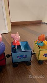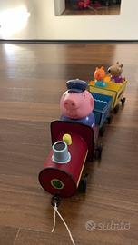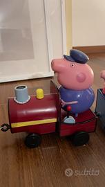 Trenino con nonno Pig e personaggi. Dotato di suoni e canzoncina di nonno Pig. Possibile trainarlo avendo ruote girevoli. Dotato di 2 vagoni.