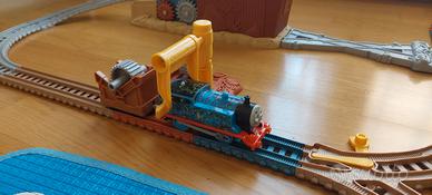 pista trenino Thomas completa di ogni suo accessorio, pari al nuovo. trenino elettrico con vagone posteriore porta ingranaggio. ponte sospeso automatico e curve paraboliche. Il trenino ad ogni passaggio carica un ingranaggio in automatico per poi scaricarlo alla stazione successiva. Il bambino dovrà riarmare il ponte e il braccio per lo scarico dell'ingranaggio. È presente uno scambio manuale per poter collegare la pista ad altre della stessa serie.
