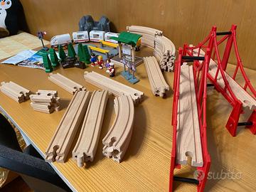 treno Brio originale 33169 AKTIONS PACKET formato da 61 pezzi compresi 16 accessori aggiuntivi in apposito contenitore originale, con istruzioni. In aggiunta alla confezione originale: 2 ponti da 34 cm, 2 salite, 4 curve, 2 rettilinei da 21 cm, 2 rettilinei da 10 cm, 4 rettilinei da 5 cm, Tutti i pezzi sono originali Brio. Possibile anche ritiro a mano a bergamo e paesi limitrofi.