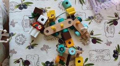 Set di costruzione trenino in legno naturale e colorato con elementi da infilare, avvitare e combinare, ideale per stimolare: