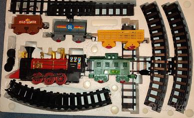 Locomotiva dettagliata accompagnata da quattro vagoni di diverso tipo e binari per creare un percorso personalizzato. La confezione originale in cartone presenta alcuni segni di usura. Si segnala che il prodotto non è nuovo e i meccanismi interattivi (luci, suoni, fumo) potrebbero non funzionare perfettamente.