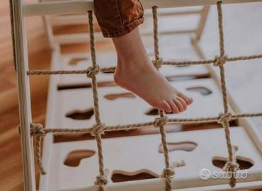 Dimensioni: Altezza 87 cm, Lunghezza 100 cm, Larghezza 62 cm Età consigliata: Adatto per bambini dai 10 mesi in su Materiale: Realizzato in multistrato di betulla, pioppo non trattato e corda di juta resistente