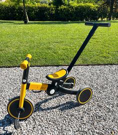 Il triciclo si trasforma agilmente da triciclo a pedali a triciclo a ruote strette (per permettere al bimbo di spingersi in autonomia) a balance bike per sperimentare l'equilibrio. Il triciclo è dotato inoltre di sellino regolabile e bastone di accompagnamento rimovibile. Infine è facilmente piegabile per portarlo comodamente in auto.
