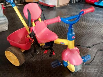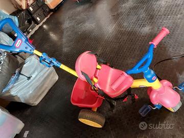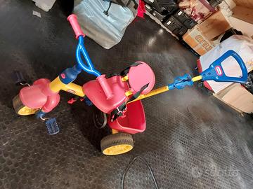 Causa inutilizzo vendo triciclo 4 in 1 della Little Tikes. Il triciclo è usato ma tenuto molto bene. Ha il telaio in acciao, il maniglione di controllo regolabile in altezza e bloccabile in sincrono con lo sterzo in modo che il bambino vada solo nella direzione stabilita, ha gli appoggiapiedi ripiegabili e gomme morbide. Manubrio e pedali possono essere esclusi o attivati per controllarli da un adulto. Comprende grande cesto e tettuccio parasole. Pagamento elettronico tramite paypal o subito oppure contanti e ritiro a mano in zona Rovereto, Trento o Mantova. Prezzo leggermente trattabile.