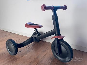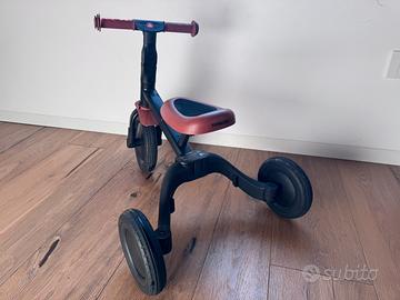 Sedile e manubrio regolabile in altezza. Le ruote posteriori si piegano verso l'interno e da triciclo si trasforma in bike. Quando non servono i pedali, vanni riposti facilmente nell'alloggiamento sotto la sella.