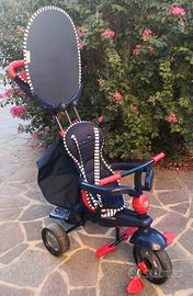 solida struttura in metallo, cinture e barra di sicurezza, pedali richiudibili e antiscivolo, sistema di blocco e sblocco dei pedali, poggiapiedi removibile, ruote con ampio raggio di sterzata, comodo sedile, capottina parasole, cestello e borsa portaoggetti. Ampio maniglione direzionale