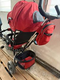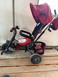 Triciclo con pedali e barra per spinta con manubrio sganciabile, cappottina e porta oggetti.