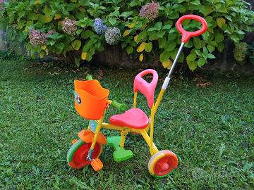 Vendo triciclo con manico per spingerlo, regolabile in altezza. Dotato di comodo cestino con musichetta funzionante a batterie, se si schiaccia apposito pulsante.