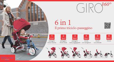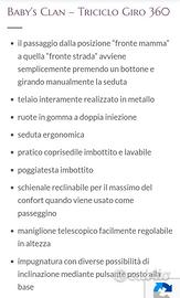 Vendo triciclo Baby's Clan 360 con maniglione, reversibile fronte mamma/fronte strada, età da 6 mesi a 48 mesi (4 anni), ottime condizioni come nuovo, con scatola originale.
