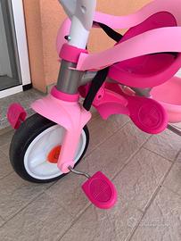 Triciclo usato pochissimo pari al nuovo, marca Smoby, colore rosa, adatto per bambini a partire dai 10 mesi, con poggia piedi regolabile in posizione e manico lungo posteriore rimovibile, borsa rosa inclusa originale (prezzo di acquisto attuale 69€). Consegna a Brusnengo, Biella da concordare