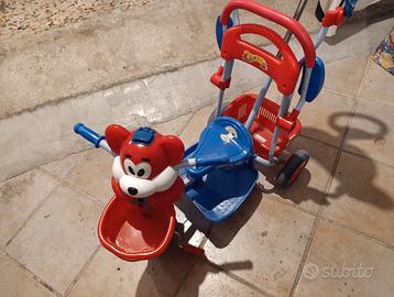 Triciclo con cappottina e manubrio dietro per gestire la guida del bambino.