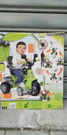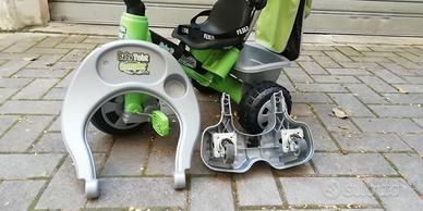 triciclo verde con parasole, borsa porta oggetti e portabagagli. Si trasforma da triciclo per piccoli 10-24 mesi con appoggiapiedi con ruotine ruotanti di 360° e protezioni laterali (oggi smontate ma incluse) in triciclo per bimbi oltre 24 mesi con cinture e pedali autonomi. Le ruote posteriori sono nuove in quanto recentemente sostituite. Può essere spinto / indirizzato da un adulto con il manubrio posteriore o in autonomia dai bimbi più gradi con pedali e manubrio anteriore. Ha freno a mano. Peso 7,3 kg, altezza max 92 cm, lunghezza 95 cm, larghezza 50 cm