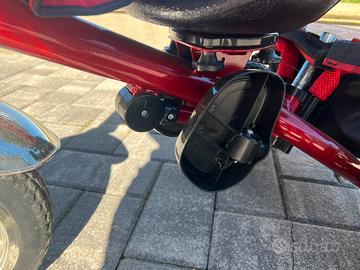 Triciclo modulare con telaio in metallo. Usabile da 1 a 4 anni con pedane, pedali, vani portaoggetti, tendalino anti sole, maniglione collegato allo sterzo.