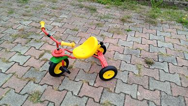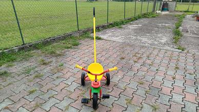 Triciclo in plastica e metallo, colorato, con pedali e maniglione posteriore per aiutare i più piccoli a pedalare. In buone condizioni, pronto all’uso.