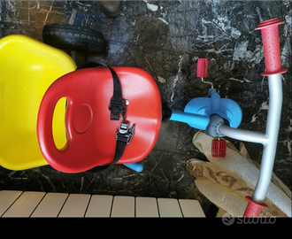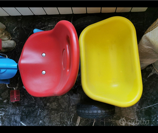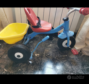 Triciclo senza o con asta per spingere il bambino/a. Completo di cinghia di sicurezza, freno e di portaoggetti ribaltabile vedi foto. L'asta serve per tenere sotto controllo il bimbo ma si può togliere e il bimbo può andare da solo. Fatto di plastica e acciaio. Usato in ottime condizioni.