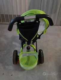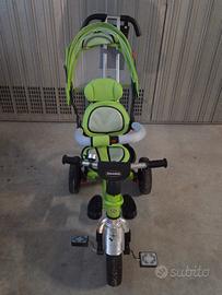Triciclo con maniglione e cappottino di colore verde, comodo per portare i bambini piccoli a passeggio al posto del passeggino.