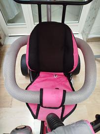 Triciclo evolutivo rosa perfetto per accompagnare la crescita del bambino. Dotato di Capottina parasole, manico regolabile in altezza per poter guidare il bambino in sicurezza, poggiapiedi, barra di protezione, cintura di sicurezza e riduttore imbottito. Accessori che man man si tolgono per poi utilizzare il triciclo.