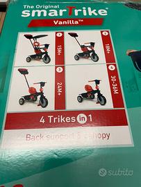 Vendo triciclo SmarTrike Original modello "Vanilla", un sistema 4-in-1 progettato per seguire la crescita del bambino dai 15 mesi fino ai 3 anni (36 mesi). Il triciclo è estremamente versatile e si trasforma in 4 fasi per accompagnare lo sviluppo motorio del bambino: 1. 15+ Mesi: Massimo controllo dei genitori con maniglione, parasole e supporto schiena. 2. 18+ Mesi: Il bambino inizia a prendere confidenza restando in sicurezza. 3. 24+ Mesi: Si rimuovono le protezioni per iniziare a pedalare. 4. 30-36 Mesi: Diventa un triciclo classico a controllo totale del bambino. Caratteristiche Principali: • Touch Steering: Tecnologia brevettata per una guida fluida e manovre facili con un tocco (controllo genitore). • Ammortizzatore brevettato: Per una guida confortevole su diverse superfici. • Accessori inclusi: Cappottina parasole regolabile, borsa portaoggetti coordinata e schienale alto. • Montaggio Rapido: Facile da assemblare e convertire tra le varie modalità. Il treciclobè nuovo, mai aperta la scatola e mai montato