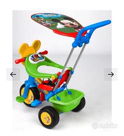 Triciclo Mickey Mouse, tendina parasole, maniglione per i genitori, portaoggetti posteriore, gioco sullo sterzo. Il maniglione può essere tolto per una guida autonoma del bambino