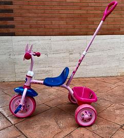 Triciclo in metallo a ruota libera, con maniglione posteriore direzionabile ed estraibile (altezza massima 95cm), cestino portagiochi, seduta regolabile in 2 posizioni. Manca solo la cinta