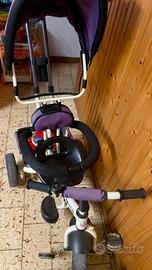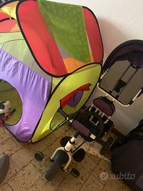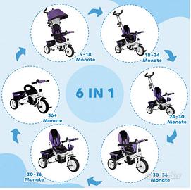 Triciclo 6 in 1. 3ruote garantiscono un equilibrio ottimale, mentre il solido telaio in metallo offre la massima stabilità. Il sedile è dotato di una barra di sicurezza e di un'imbracatura di sicurezza a 5 punti. Il tettuccio rimovibile e il maniglione regolabile offrono flessibilità e comfort. Il parafango e il poggiapiedi pieghevole sulla ruota anteriore offrono ulteriore protezione e comfort. Un cestino portaoggetti e un portabicchieri. ● Il triciclo per bambini è adatto a bambini di età compresa tra 1 e 5 anni e con un peso massimo di 25 kg. Altre cosine simili nel mio profilo. Spedizione rapida.