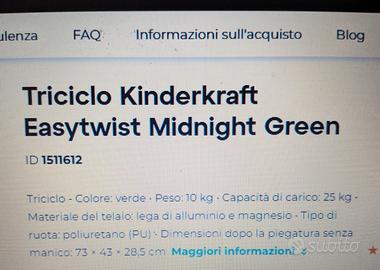 Vendo comodo passeggino triciclo Kinderkraft colore verde scuro, utile per le prime pedalate dei bambini quando loro non vogliono più utilizzare il passeggino classico. Si consegna a mano a Trento. Vendo a 70 euro