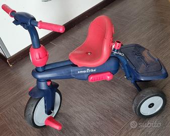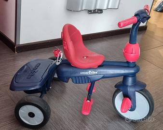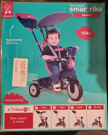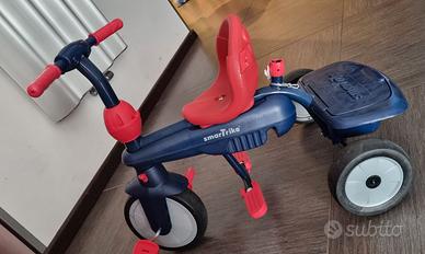 Triciclo 4in1 Smartrike Vanilla Rosso e Blu Navy da 15m a 36m+. Struttura in metallo, seduta con schienale removibile, capote parasole regolabile, cinture e barra di sicurezza, poggiapiedi richiudibile, sistema di blocco e sblocco dei pedali, ruote in gomma, cestello posteriore, portaborraccia anteriore e borsa portaoggetti. Ampio maniglione direzionale allungabile. Alcune parti non sono mai state montate e utilizzate (vedi foto n.6).