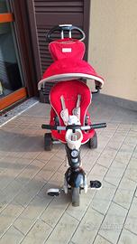 Triciclo smart trike 4 in 1 rosso e nero completo di tutti gli accessori, composto da: parasole, bastone guida con marsupio, protezione caduta e appoggia piedi oltre ai pedali.