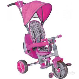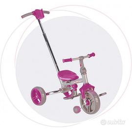 Triciclo evolutivo. Può essere usato in diverse modalità: Viene inizialmente utilizzato con il suo schienale e il poggiapiedi. Il tuo bambino è comodamente seduto, e può essere spinto comodamente dai genitori. Più tardi lo schienale e il maniglione per la spinta vengono rimossi ed è tuo figlio che muove il suo triciclo pedalando. Sviluppa la motricità e l'equilibrio in totale sicurezza. Da chiuso occupa pochissimo spazio.