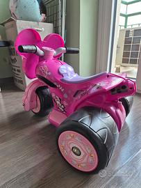 Questo oggetto è una Trimoto Samurai Minnie Mouse 6V Rosa prodotta da Injusa. Destinazione d'uso: Veicolo elettrico per bambini dai 1 ai 3 anni. Velocità: Raggiunge una velocità massima di circa 2-3 km/h tramite pedale acceleratore. Sicurezza: È dotata di tre ruote larghe in plastica per garantire maggiore stabilità e prevenire sbilanciamenti. Batteria: Include una batteria da 6V con relativo caricabatterie. Design: Presenta decorazioni permanenti e impermeabili ispirate al personaggio di Minnie Mouse. Usato poco e prevalentemente in casa.