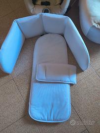 Trio CAM modello Fluido, colore beige composto da: navicella completa di riduttore e cinture per uso in auto; ovetto completo di riduttore e base ovetto Cam per auto; passeggino con coprigambe. Incluso anche ombrellino e copripasseggino antipioggia.