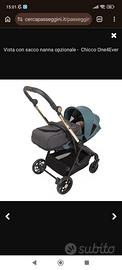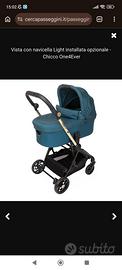 passegginoChicco One4Ever, è adatto dalla nascita fino a 22 Kg del bambino. La sua caratteristica principale è cheinclude 2 sedutedifferenti per seguire la crescita del bambino: Prima seduta: è omologata dalla nascita fino a 22 Kg, reversibile fronte strada/fronte genitore, reclinabile fino alla posizione nanna e con schienale regolabile in altezza in 3 posizioni (contemporaneamente con le cinture di sicurezza) per seguire la crescita del bambino. Include inoltre un materassino riduttore imbottito e avvolgente, ideale per accogliere il bambino fin dai primi mesi e la cappottina parasole impermeabile con protezione UV50+. Peso del passeggino con prima seduta: 7,8 Kg Seconda seduta: è omologata dai 6 mesi fino a 22 Kg ed è reclinabile. Quando il bambino crece si può scegliere di agganciare questa seduta più leggera (si può utilizzare con o senza il poggiagambe, che si recupera dalla prima seduta). Anche in questa seduta è presente una cappottina parasole impermeabile e con protezione solare UV50+. Peso del passeggino con seconda seduta: 6,8 Kg. Il passeggino One4Ever, si può inoltre trasformare insistema modulare Trio, abbinando i seguenti componenti venduti insieme: la navicella Light, il sacco Nanna, ovetto auto presenta piccoli segni di usura sul telaio e un piccolo taglio sul tessuto della navicella