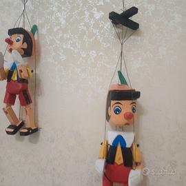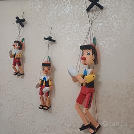 trio di burrattini pinoccchio marionette con fili in legno in tre misure diverse cm 50 - cm 25- cm 20