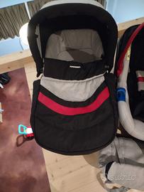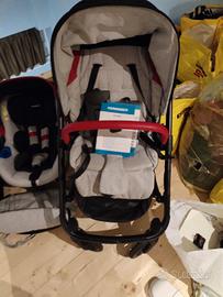Sistema combinato elegante e compatto, composto da passeggino, navicella pieghevole, seggiolino auto e borsa dotata di tasca termica a 2 vani; testato a normativa europea