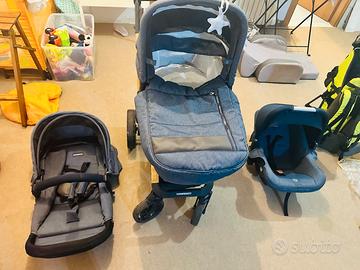 Sistema combinato composto da: Navicella, Passeggino e Seggiolino auto i-Size. Telaio in alluminio, maniglione rivestito in EVA. Sono inclusi cesto portaoggetti, coprigambe e parapioggia. Testato a Normativa Europea. Passeggino: per bambini da 6 mesi a 15 kg (circa 3 anni), chiudibile a libro con seduta reversibile (fronte/strada - fronte/genitore). Capottina richiudibile e removibile, con finestrella osserva bimbo. Schienale Reclinabile a più posizioni. Imbragatura a 5 punti regolabile con protezioni pettorali. Ruote anteriori piroettanti con dispositivo di bloccaggio. Freno di stazionamento a pedale.