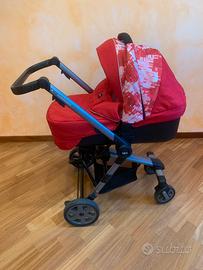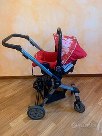 Passeggino trio Foppapedretti composto da ovetto, navicella rigida, passeggino posizionabile fronte strada o fronte mamma, copertura trasparente impermeabile,borsa tappetino e libretto di istruzioni.