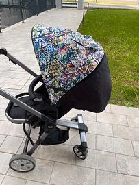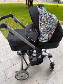 Trio completo , composto da navicella, passeggino e ovetto, comprensivo anche della borsa per il cambio del neonato, disegnata con la stessa fantasia.