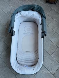 Culla con schienale regolabile e materasso in fibre naturali, seggiolino auto, passeggino completamente reclinabile in posizione sdraiata, telaio e standup.