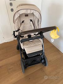 Trio Inglesina beige con bracciolo e dettagli in pelle marrone, completo di ogni accessorio e completamente sfoderabile e lavabile.