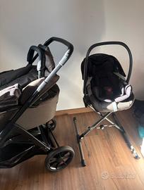 Trio in perfette condizioni, colore verde scuro, ruote grandi comodissimo. Navicella, ovetto, passeggino + stand per casa.