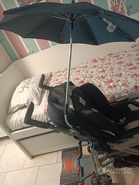 Trio in ottime condizioni, usato pochissimo e completo di tutti gli accessori (Base Huggy Isofix, borsa + fasciatoio portatile, saccottino, cappotta, parapioggia, porta biberon, cesto, istruzioni). Aggiungo in omaggio al trio cuscinetto e materassino, ombrellino Prenatal e riduttore per ovetto. L'unica pecca è il rivestimento del corrimano un po' consumato (vedi foto).
