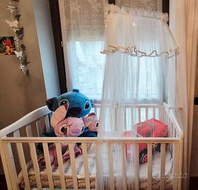 Lettino di legno, rete regolabile con posizione nextome, bianco, con baldacchino, materasso e biancheria da letto inclusa. Usato ma ben tenuto.