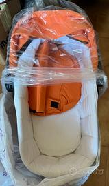Navicella: Dotata di scocca rigida, è omologata per il trasporto in auto (Gruppo 0, fino a 9 kg). Presenta un maniglione ergonomico per un facile trasporto e rivestimenti sfoderabili e lavabili.