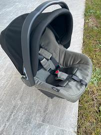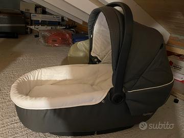 Passeggino trio Peg Perego Book 51 usato, color verde militare, composto da ruote, navicella con copertura invernale, passeggino, borsa, ovetto, base fissa per supporto in casa.