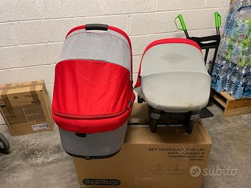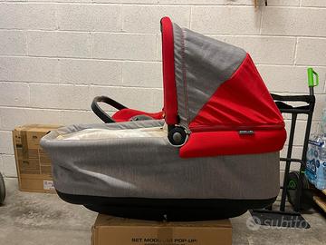 Trio Peg Perego book plus popup colore Tulip(rosso e grigio), Imballi originali (4), istruzioni,Carrello book plus , navicella pop-up, ovetto primo viaggio SL, seggiolino pop-up con copri gambe e parapioggia originali, belted base, Borsa originale. Presente chiazza su copertura ovetto e gomma di copertura del manico carrello usurata.
